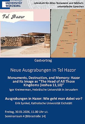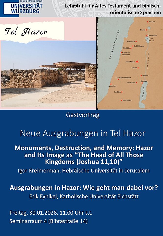 Hazor stellt als eine der bedeutendsten Städte der südlichen Levante in der mittleren und späten Bronzezeit eine bedeutende archäologische Ausgrabungsstätte dar. Igor Kreimerman (Hebrew University), der gemeinsam mit Erik Eynikel (KU Eichstätt) die Ausgrabungen in Hazor leitet, gibt Einblick in den Stand der archäologischen Forschung, die Zerstörung der Stadt im 13. Jh. v. Chr. und die spätere Erinnerung an Hazor, das nach Jos 11,10 "früher die Oberherrschaft über alle diese Königreiche" innehatte. Im Anschluss wird Erik Eynikel praktische Informationen über die Ausgrabungen, die im nächsten Sommer in Hazor stattfinden werden, geben: täglicher Arbeitsplan, erforderliche Ausrüstung, Wochenendprogramm sowie eine zusätzliche Studienreise.